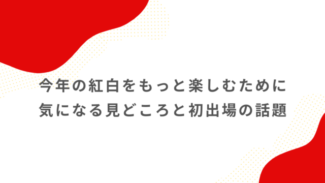 年末が近づくにつれて、少しずつ明らかになってきた紅白歌合戦 2025 曲の情報。12月上旬以降、追加の出演者や一部の歌唱曲が発表され、今年の紅白の輪郭も見えはじめています。この記事では、紅白歌合戦 2025 曲を軸に、・誰が追加で出場するの...