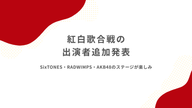 SixTONES・RADWIMPS・AKB48のステージが楽しみ今年の紅白に向けて、新たに大型アーティストの出場発表が続いています。今回新たに SixTONES・RADWIMPS・AKB48(OGメンバー含む) の出演が決定し、番組全体の期...